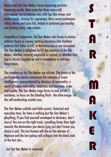 Star Maker is devised by Mark Harris and David Burrows, both of whom thought of an exhibition drawing upon ideas about matter, life-forms, time, entropy and utopia in Olaf Stapledon’s book Star Maker at exactly the same time. The installation is the work of Anthony Gross and David Burrows.